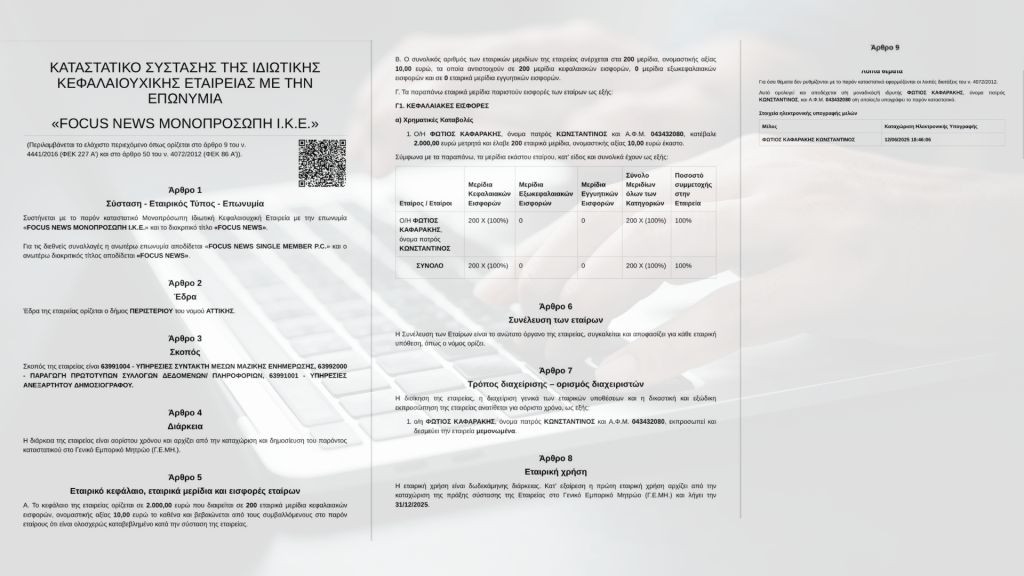 Καταστατικό σύστασης της ιδιωτικής κεφαλαιουχικής εταιρείας FOCUS NEWS, με πληροφορίες για τις υπηρεσίες και τη διοίκηση.